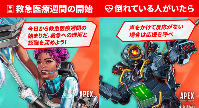 救急医療週間:東京消防庁×APEX コラボが開催中 レジェンドたちが、救急医療で重要なポイントをアナウンスしています。 【#ApexLegends ×#東京消防庁 】 9月7日から9月13日は救急医療週間! ApexLe…